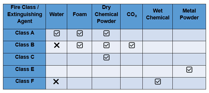 Extinguishing agents used in conventional fire classes are summarized in the table below.