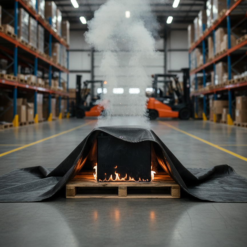 The Nivofire Li-ion Battery Fire Blanket is specifically engineered to address these challenges. It is constructed in multiple layers using high-temperature-resistant fabrics, providing a reliable and effective solution for containing and controlling battery fires. By quickly suppressing flames and limiting the spread of toxic gases, it protects people, equipment, and the environment in facilities where lithium-ion batteries are manufactured, stored, repaired, or recycled.